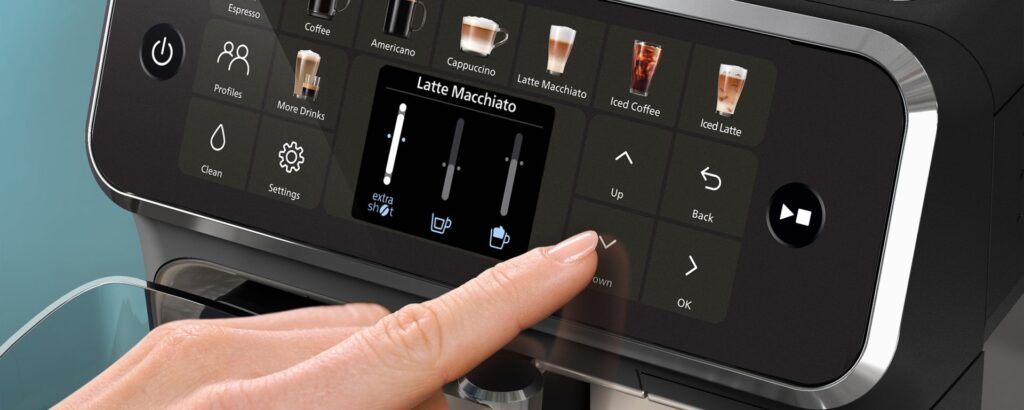 La LatteGo 5500 destaca por su interfaz intuitiva y su funcionamiento mayoritariamente automático. Su pantalla táctil TFT permite seleccionar bebidas con iconos y textos claros, ajustar intensidad, volumen y temperatura, y guardar hasta 4 perfiles de usuario distintos, lo que resulta muy práctico para familias o entornos con varias preferencias de consumo.